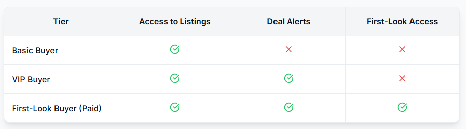 A priority-access membership that gives you first look at new deals, direct broker contact, and white-glove deal alerts.