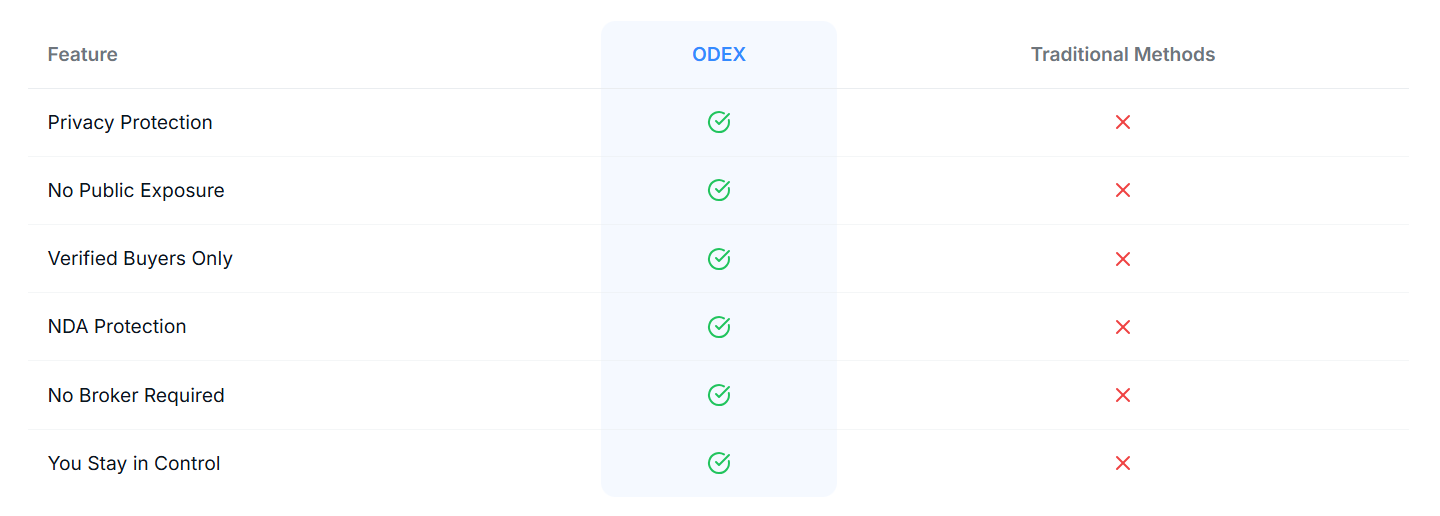 *ODEX is not a broker and does not represent sellers. We provide private digital infrastructure that enables you to list your property under NDA, without public exposure or intermediary involvement.*